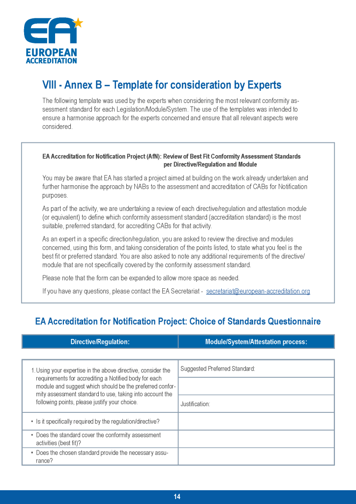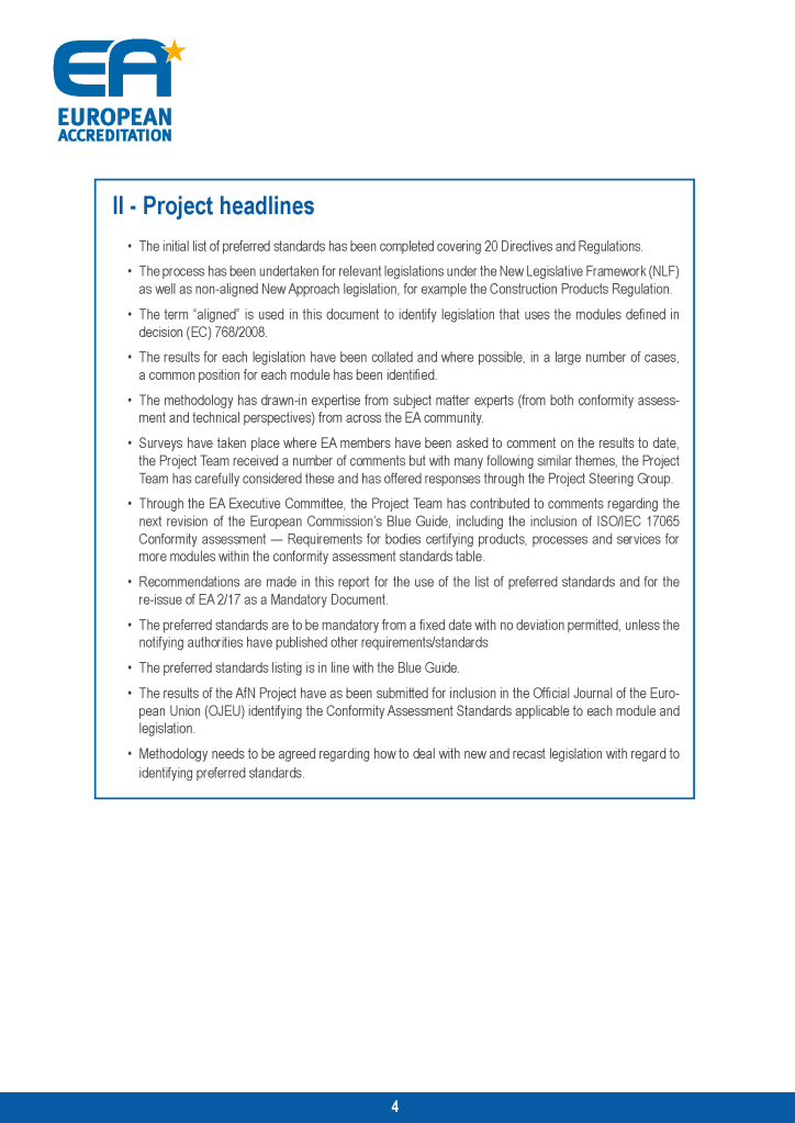 Hence, the European co-operation for Accreditation (EA) started in 2014 the so-called ‘Accreditation for Notification’ (AfN) project with the aim of harmonizing the accreditation requirements used as a basis for notification by defining the preferred harmonized standards for each Union Harmonization Legislation.