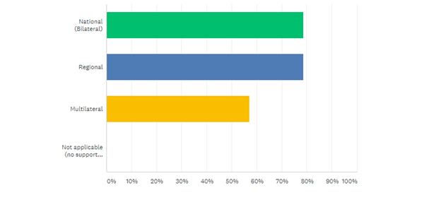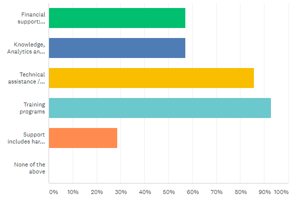 Most supporting efforts go to the area of capacity building, and training programs (93%), while technical assistance and advisory services receive (86%) of the support. Other types of support include financial support (lending and/or grants, 57%), knowledge, analytics, and diagnostic studies (57%), and hard infrastructure (29%).