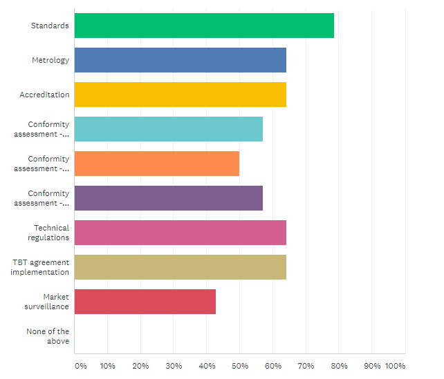 Standards reform is the dominant QI area for development work (79%), followed by metrology (64%), accreditation (64%), technical regulation (64%), TBT agreement implementation (64%), inspection (57%), certification (57%), testing (50%) and market surveillance (43%).