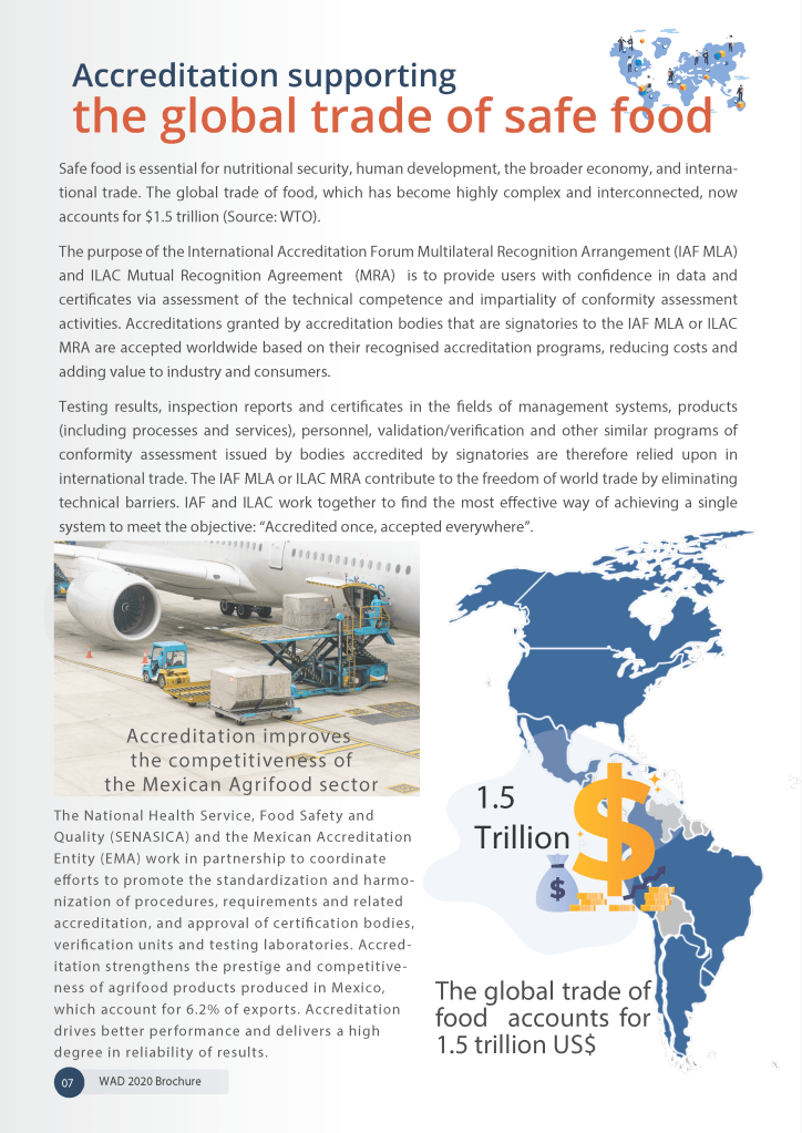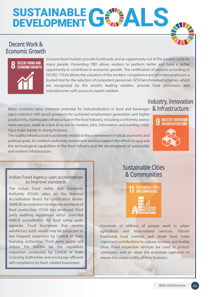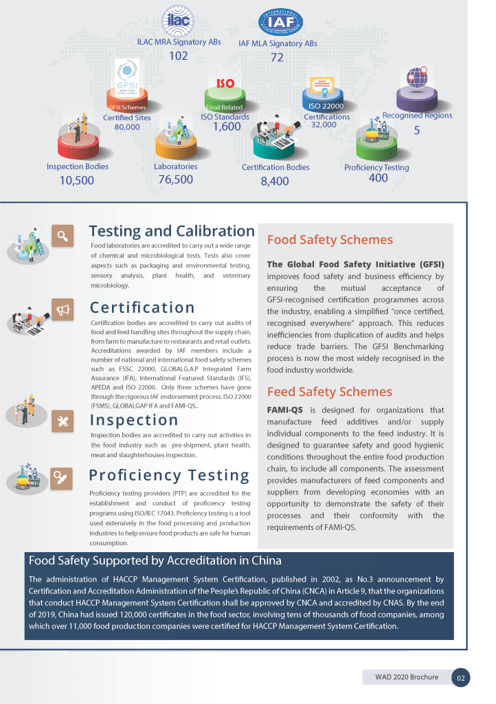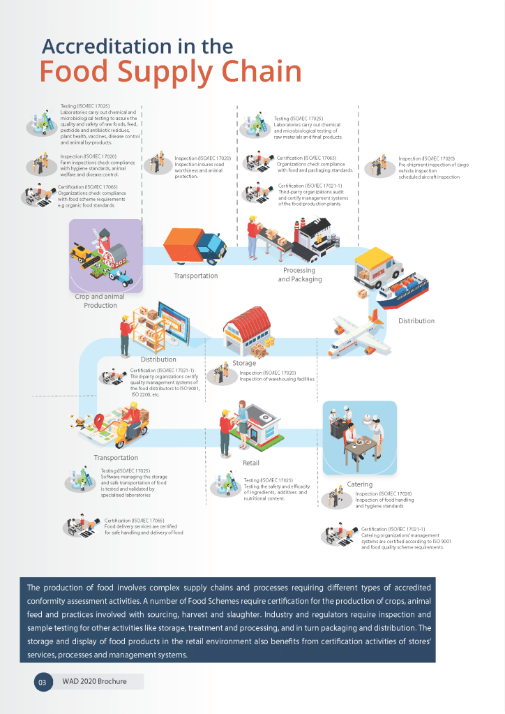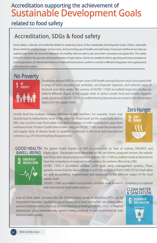 World Accreditation Day 2020 was designed to illustrate how in the area of food safety, accreditation contributes to the Sustainable Development Goals, particularly SDG 3 of Good Health and Well-Being. World Accreditation Day 2020 came just two days after the second ever World Food Safety Day², which aims to highlight the need for safe food. Through accreditation bodies and subsequently accredited certification bodies, inspection bodies and laboratories, the conformity assessment community continuously strives to help deliver safer food.