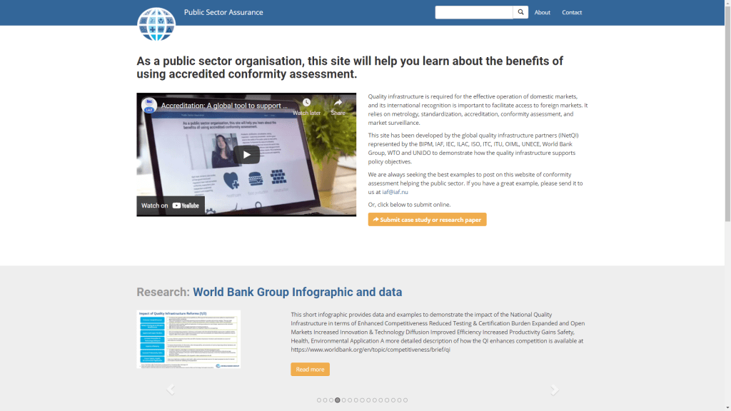Public Sector Assurance (www.publicsectorassurance.org) demonstrates how QI services are supporting central governments, local governments and regulators in meeting policy objectives and improving their own performance. The site contains materials showing the benefits of the use of conformity assessment in the areas of economic development, healthcare, environmental protection, energy, food safety and agriculture, construction, crime and security, trade, health and safety, products and services, and efficient delivery of public services.