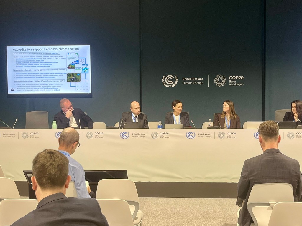 In COP 29, IAF participated in several important events. The first one—IAF’s official COP 29 ‘side event’—focused on the theme of “Building trust and scaling action through the international standards system for a just transition”. Alongside experts from the British Standards Institution (BSI), Oxford University, International Organization for Standardization (ISO) and International Electrotechnical Commission (IEC), Maria Varbeva-Daley of the United Kingdom Accreditation Service (UKAS), attending on behalf of IAF, spoke about the critical, yet often invisible, pillars of trust and credibility that accreditation offers, highlighting how accreditation bodies worldwide are already mobilizing to address the growing demand for accredited conformity assessment (assurance) against climate-related standards. This includes preparations to provide accredited assurance for the future ISO net zero standard.